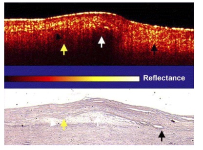 “In a 1990s study, the three plaques were respectively differentiated as: 1) homogeneous, signal-rich region, well-delineated; 2) signal-poor region with sharp borders; and 3) signal-poor region with diffuse borders. Therefore, fibrocalcific and lipid laden plaques are distinguished by the sharp versus diffuse borders; however, this study was associated with a high false positive rate, with fibrous caps being diagnosed as lipid laden plaques (sensitivity 71% to 79%). The difficulty in identifying plaque by the diffuse nature of the plaque border is exemplified by figure,from our initial paper published in Circulation on plaque rupture. In this figure, the yellow arrows demonstrate a cap-lipid interface that is diffuse and is covered by a cap with high light scattering (yellow reflections). The white arrow, which is also identifies a region over lipid, identifies a cap-lipid interface that is sharply defined, but the cap is associated with lower scattering. Finally, the black arrow shows an intimal cap that is highly scattering over the intimal-elastic interface (no lipid present). The interface is poorly defined in spite of lack of lipid. The diffuse nature of the intimal-elastin border appears to be that multiple scattering by the cap that is obscuring the border (which would also explain a more rapid local exponential decay). It is unclear, therefore, whether the lipid interface is diffuse in some OCT images because of the core composition, as previously suggested, or multiple scattering from the cap, the latter of which could reduce its predictive power. Future studies are required to establish the mechanism as to why some plaques have diffuse cap/core interfaces”.
